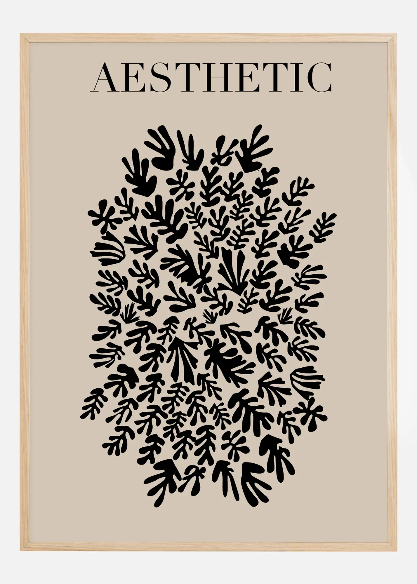 Ar savu modernu izpausmi un vienkāršo krāsu paleti, kas ierobežota līdz melnai un bēšai, šis izdrukas attēls sniedz nomierinošu un līdzsvarotu iespaidu. Vārds "AESTHETIC", kas novietots motīva augšējā daļā, darbojas kā spēcīgs atgādinājums par dizaina un dabas mūžīgo skaistumu. Šis plakāts lieliski papildinātu interjeru, kurā vēlas radīt mierīgu un iedvesmojošu oāzi, vai būtu daļa no plašākas sienas galerijas, veidojot vienotu vizuālo pieredzi.