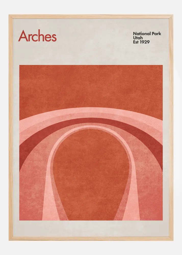 Šis minimālistiskais un mūsdienīgais plakāts godina Arches Nacionālo parku Jūtā ar savu stilizēto parka slaveno ģeoloģisko veidojumu attēlojumu. Koncentriskais arkas formas veidojums, kas ir dizaina centrā, ir dabisko arkas abstrakcija, kas veido parka unikālo ainavu, šeit attēlots tīrā un vizuāli pievilcīgā veidā.