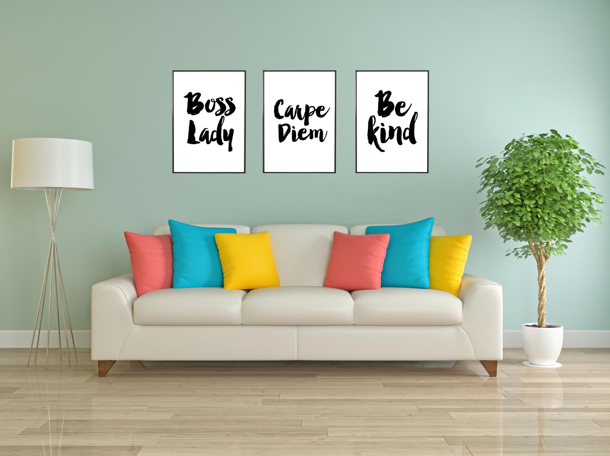 Stilīgs plakāts, kas ir izdevīgi saskaņots ar citiem motīviem, lai izveidotu modernu attēlu sienu.