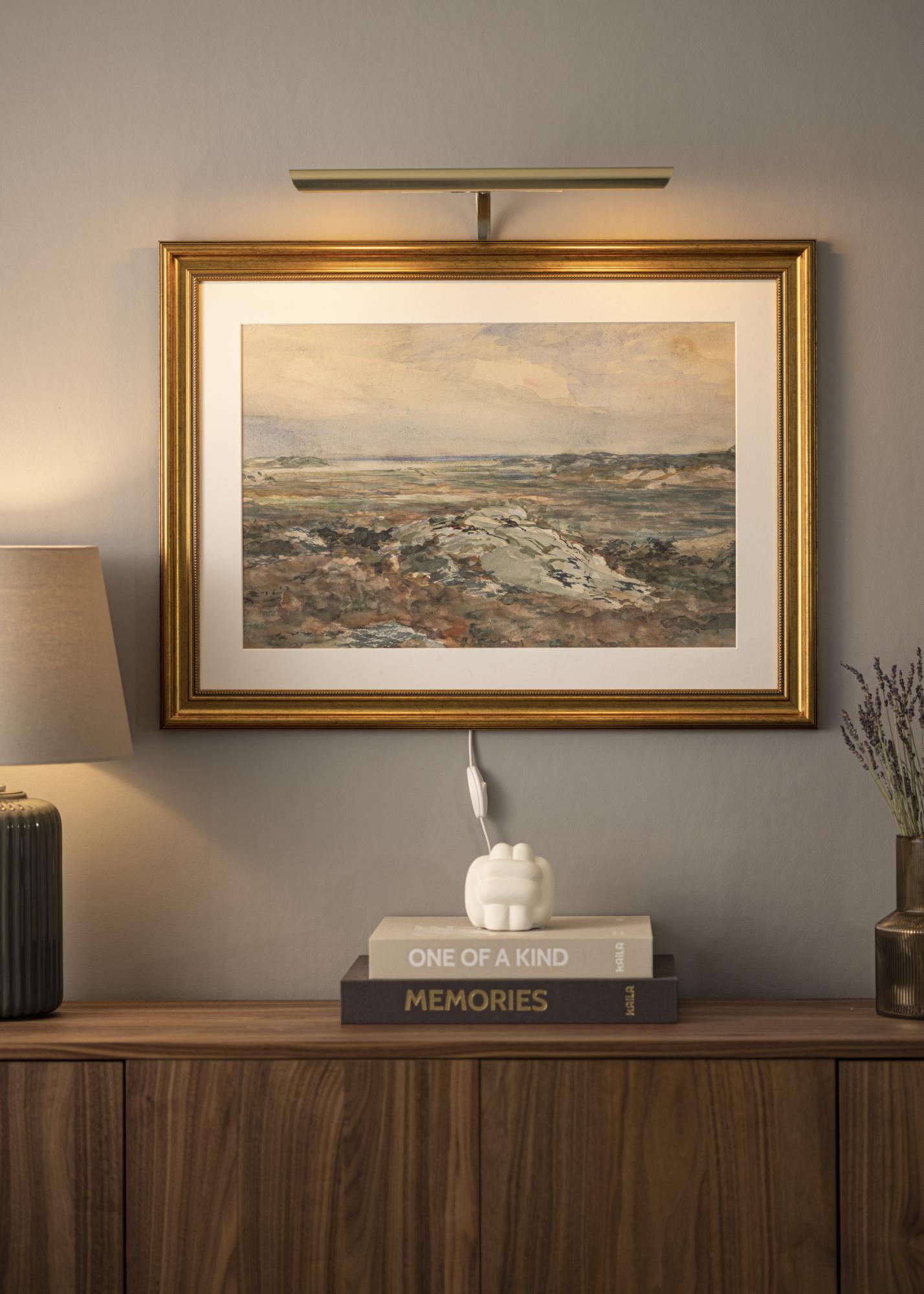 Parasti jūs piestiprināt gleznu apgaismojumu rāmja aizmugurē, bet trūkums ir tas, ka ir nepieciešams koka rāmis (daži kompozītrāmji ir arī piemēroti), kuram ir plats profils, lai būtu iespējams ieskrūvēt rāmju turētājus. Ar mūsu sienas stiprinājumu jums nebūs jādomā par to, bet drīzāk vienkārši uzstādiet savu gleznu apgaismojumu tieši uz sienas aiz gleznas.