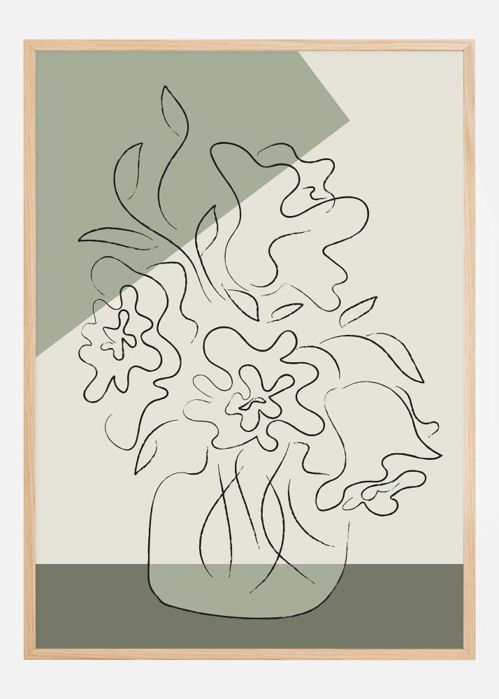 Šis mākslinieciski abstraktais plakāts attēlo stilizētas ziedlapas un lapotni elegantā, plūstošā līnijas zīmējumā, kas plūst pāri divkrāsainam fonam ar maigi zaļiem un neitrāliem toņiem. Dizaina vienkāršais skaistums, ko pastiprina vāja tekstūra, kas piešķir organisku sajūtu, rada relaksējošu un mierīgu atmosfēru. Šis moderns un stilīgs drukājums būtu ideāli piemērots minimālistiskam vai skandināviski iedvesmotam mājoklim, pievienojot dabas mieru bez pārmērīgas krāsas vai sarežģītības.