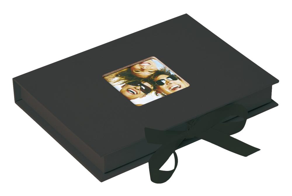 Stilīga foto kaste ar modernu dizainu eleganti melnā krāsā, kas var ietilpt 70 bildes izmēros līdz 13x18 cm. Kastes augšpusē ir vieta savai bildei (6x6 cm), lai jūs viegli varētu personalizēt savu foto kasti.