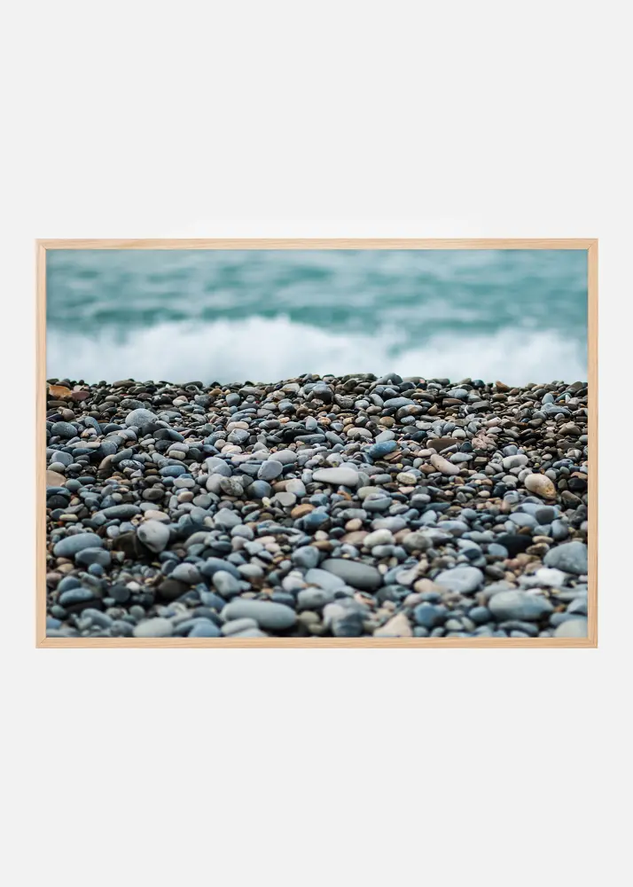 Dzirdi jūras viļņu šalkoņu no šī plakāta ar skaistu akmeņainu pludmali priekšplānā. Īsais fokusa dziļums rada interesantu attēlu, kas piesaista acis attēlam. Vai atrodi kādu apaļi noslīpētu stikla gabalu starp akmeņiem? Pelēkzilā krāsas gamma labi izskatās ar šauru rāmi pret gaišu sienu, vēlams ar jūras aksesuāriem.