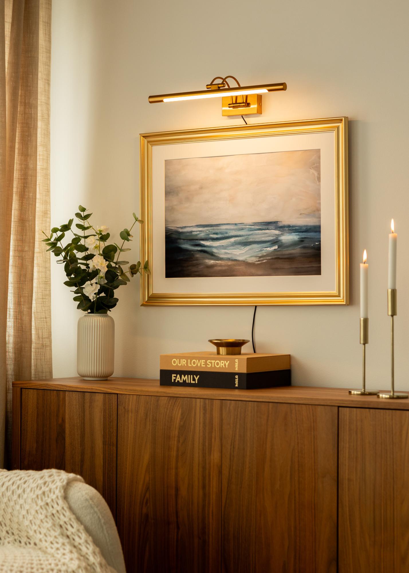 Šis elegantais gleznu apgaismojums misiņa krāsā ir izstrādāts, lai izceltu jūsu mākslas darbus stilīgā un funkcionālā veidā. Ar dziļumu 19 cm un garumu 50 cm tas lieliski der gleznām, kuru maksimālais platums ir līdz 90 cm, padarot to par daudzpusīgu izvēli dažāda veida mākslas darbiem. Iebūvētais LED gaismas avots izstaro patīkamu gaismu ar krāsu temperatūru 3000K, nodrošinot siltu un aicinošu atmosfēru, kas nav pārāk uzmācīga.