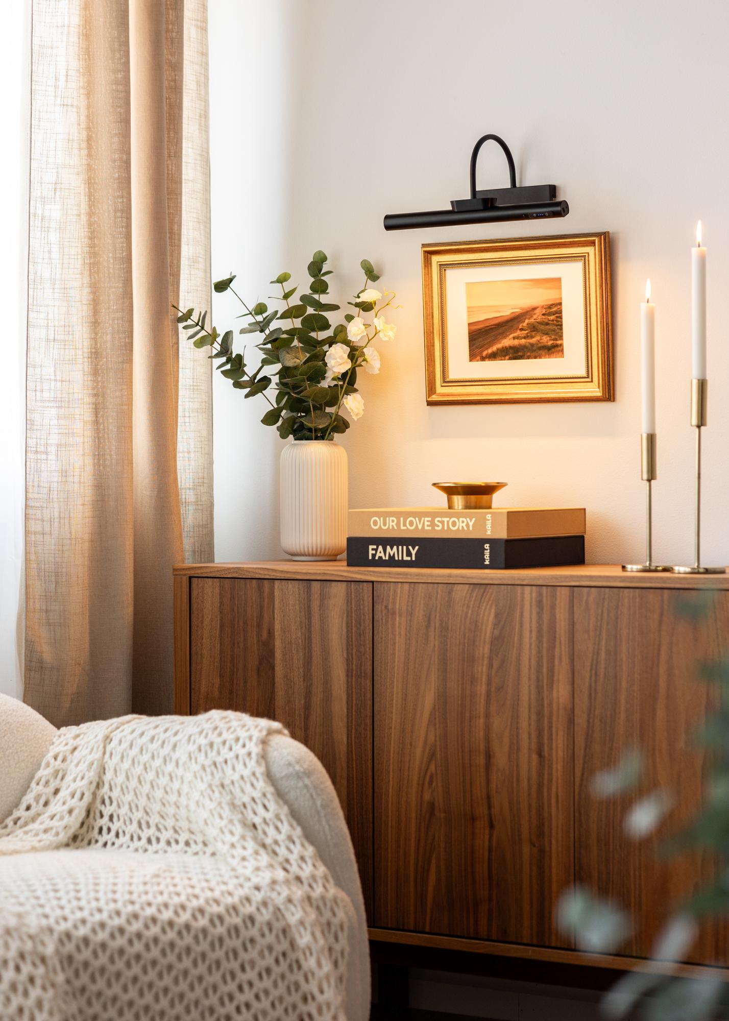 Šis ar bateriju darbināmais gleznu apgaismojums sniedz iespēju apgaismot jūsu mākslas darbus bez vadiem, kas ļauj to novietot jebkurā vietā uz sienas. Ar elegantu un modernu dizainu melnā krāsā apgaismojums harmoniski saplūst ar dažādiem interjeriem, un ar kompakto dziļumu 14 cm aizņem minimālu vietu, vienlaikus apgaismojot mākslas darbus līdz 60 cm platumā.