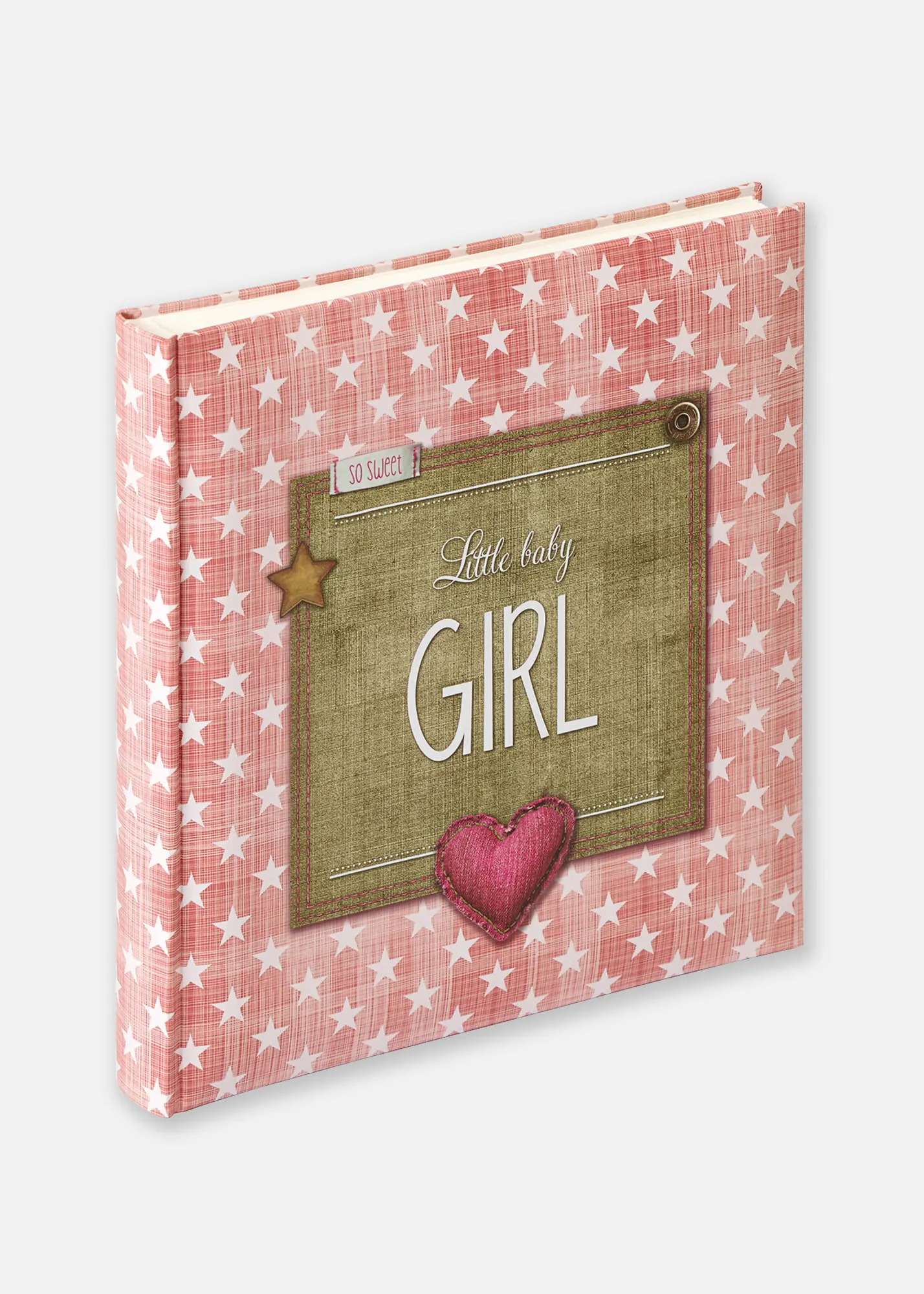 Bērnu albums ar tekstu "Little baby Girl" uz albuma priekšpuses. Albuma priekšpuse ir dekorēta arī ar daudzām mazām zvaigznēm, kas albumam piešķir aicinošu un patīkamu sajūtu.