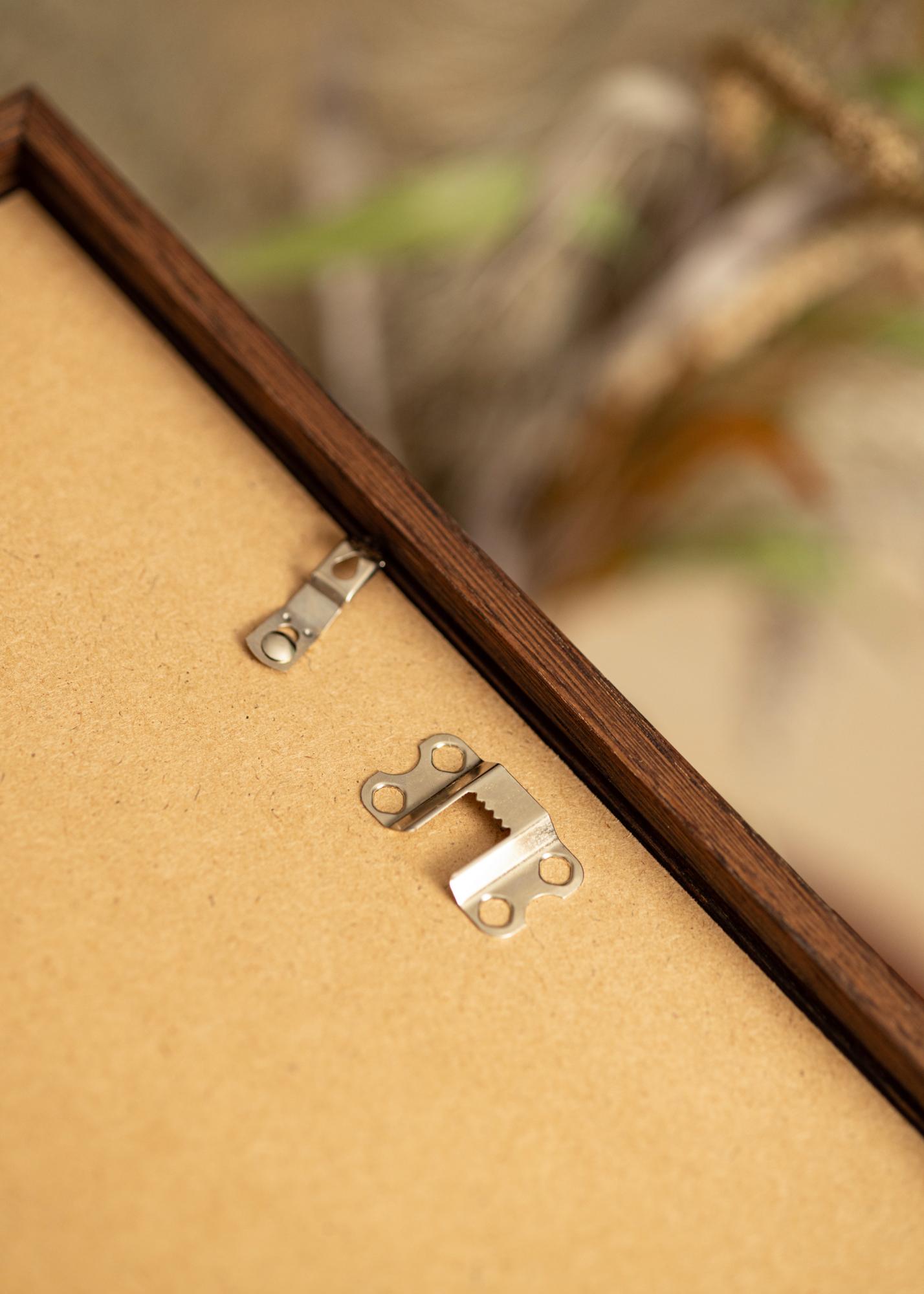 Tumši brūnā koka struktūra ar izteiktām graudotnēm rada autentisku koka sajūtu un piešķir jūsu mājai rustisku šarmu. Neatkarīgi no tā, vai vēlaties to piekārt horizontāli vai vertikāli, praktiskie metāla pakaramie aizmugurē padara to viegli pielāgojamu pēc vajadzības. Rāmis ir veidots, lai būtu piemērots motīviem izmērā 70 x 100 cm, padarot to ideālu lielākiem mākslas darbiem vai fotogrāfijām.