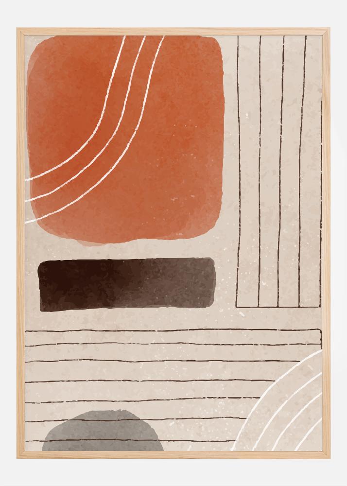Šis mākslinieciskais plakāts spēlē ar abstrakciju un ģeometriju, un izraisa dziļāku pārdomu sajūtu. Motīvā ir liels, pilns terakotas kvadrāts, kas enkuro dizainu, apjozts ar baltām līkām līnijām, kas rada kustības un maiguma iespaidu. Šī siltā, zemes krāsa rada tūlītēju siltuma un viesmīlības sajūtu.