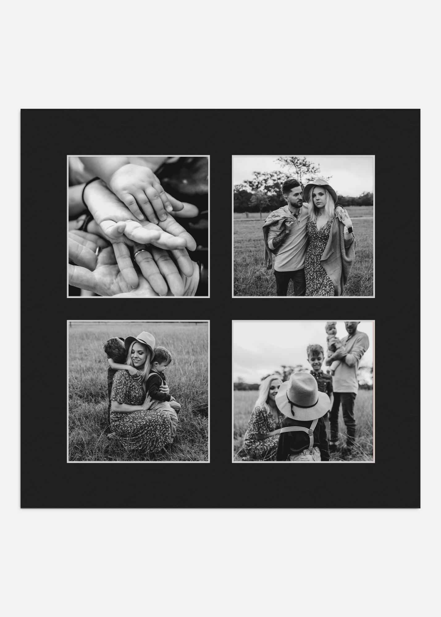 Skābju nesaturošs melns kolāžas passepartout ar augstākās kvalitātes slīpām baltām malām. Passepartout ietver vietu 4 attēliem. Ideāli piemērots, ja vēlaties izveidot savu personīgo fotokolāžu.