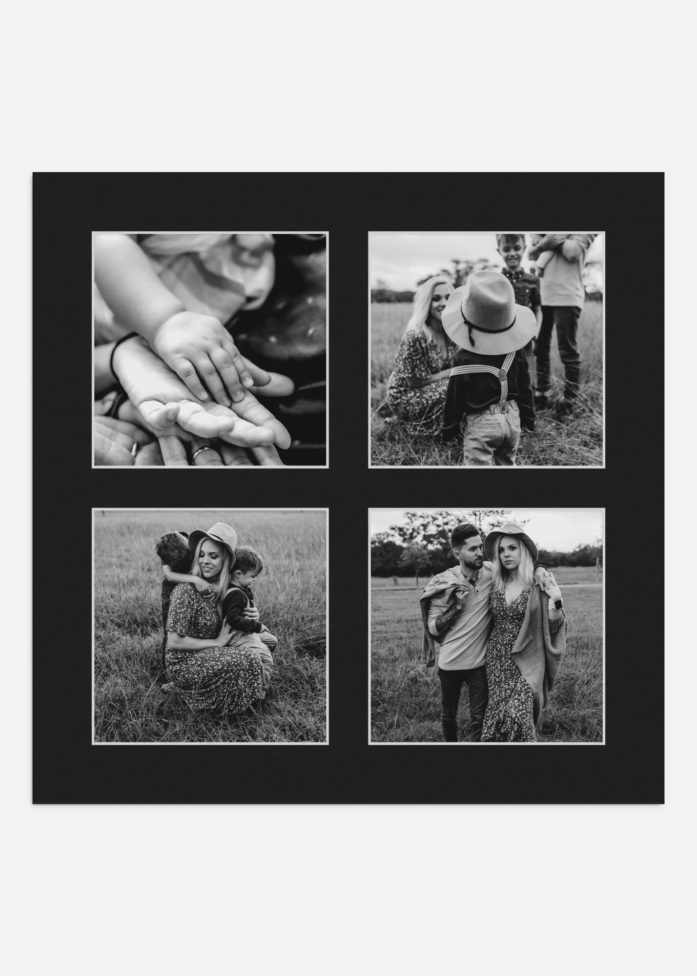 Skābbrīvs melns kolāžas passepartout ar greiziem baltiem malām, vislabākās kvalitātes. Passepartout ir vieta 4 attēliem. Lieliski piemērota, ja vēlaties izveidot savu personīgo foto kolāžu.