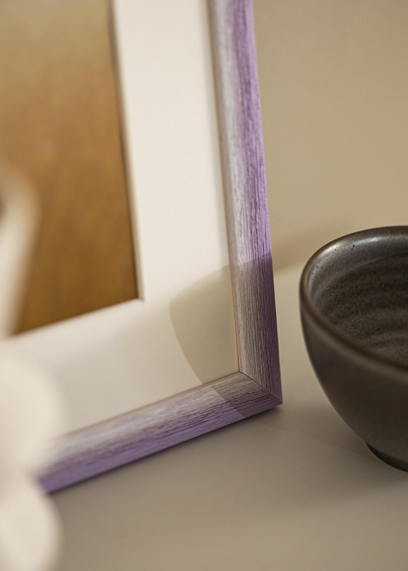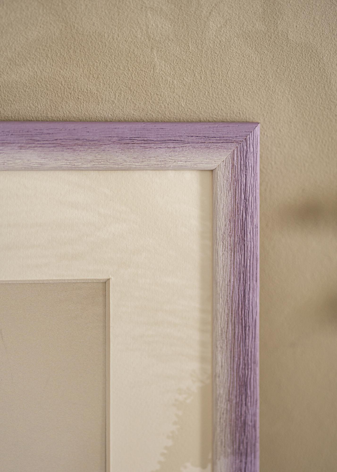 Rāmis ir izgatavots no ajosa koka un tam ir maigs krāsu pārejas efekts no gandrīz kaula balta toņa līdz maigam lavandas violetam. Izteiktā koka struktūra ar vertikālām šķiedrām rada dabisku un rustisku sajūtu, savukārt ar roku krāsotais efekts rada neuzkrītošu un dzīvu krāsu dziļumu. Virsma ir matēta, kas pastiprina harmonisko un mierpilno krāsu paleti.