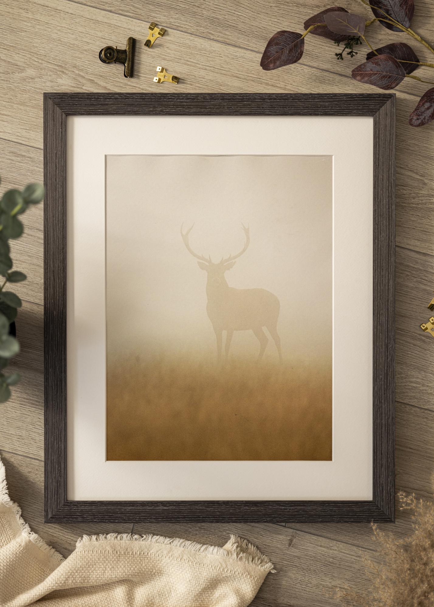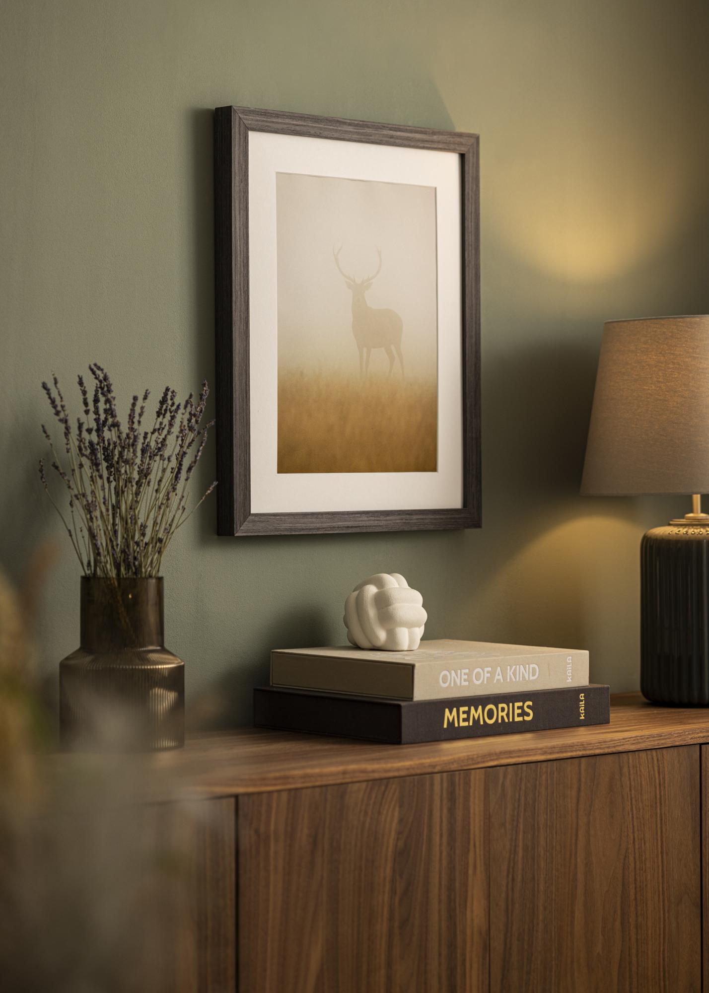 Šis attēlu rāmis ir izgatavots no priedes un tam ir tumša koka apdare ar skaidru graudu struktūru. Dziļā, gandrīz melnbrūnā toņa ļauj koka dabīgajai tekstūrai parādīties caur vieglu matētu virsmu, kas uzsver tā dabisko izskatu. Šaurs un taisns profils sniedz diskrētu un stilīgu izteiksmi, kas piemērota lielākajā daļā vidi.