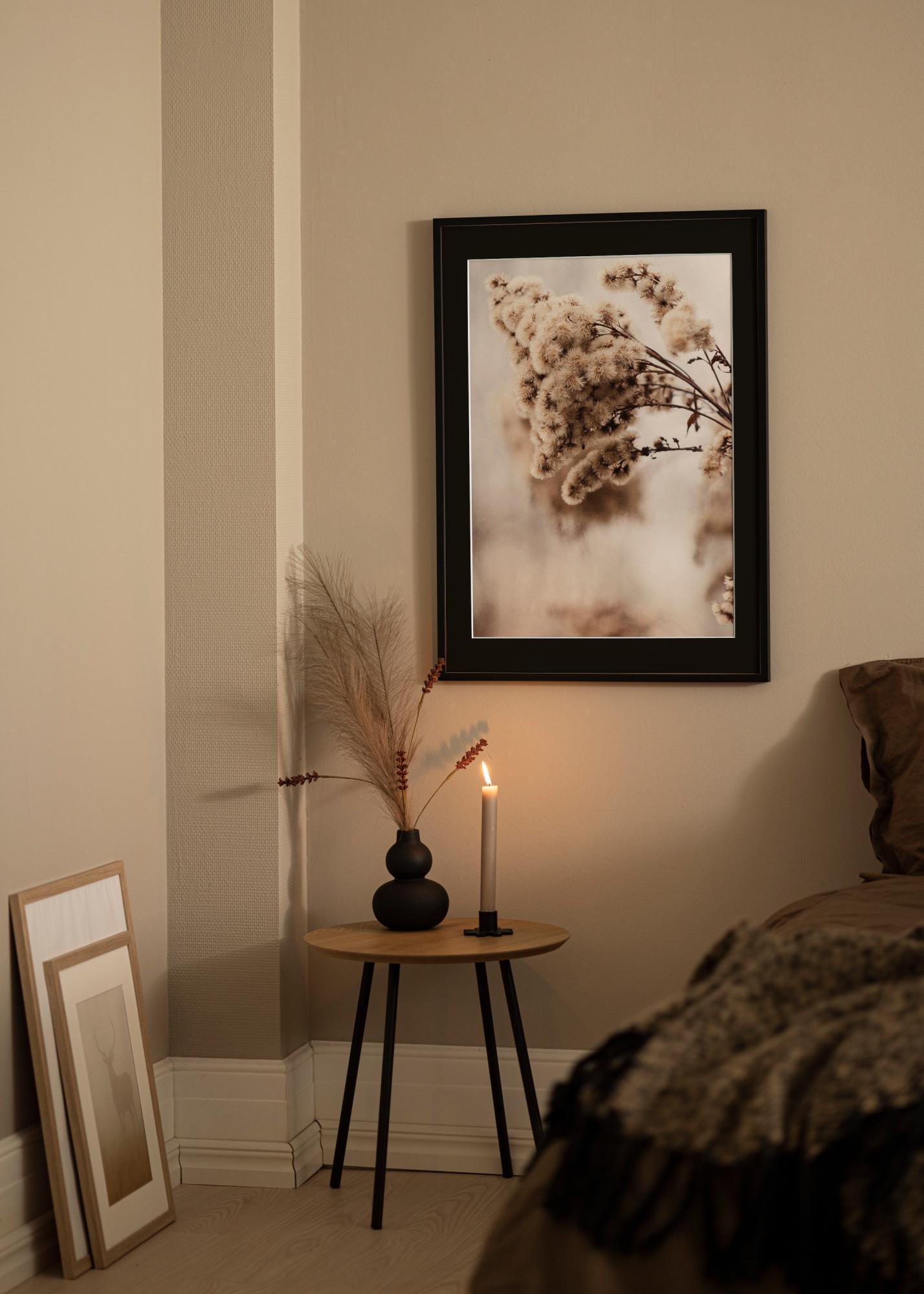 Melnais passepartout pastiprina kontrastu un piesaista skatītāja uzmanību uz attēlu. Rāmis ir aprīkots ar praktiskiem metāla pakaramiem, gatavs piestiprināšanai pie sienas gan horizontālā, gan vertikālā formātā.