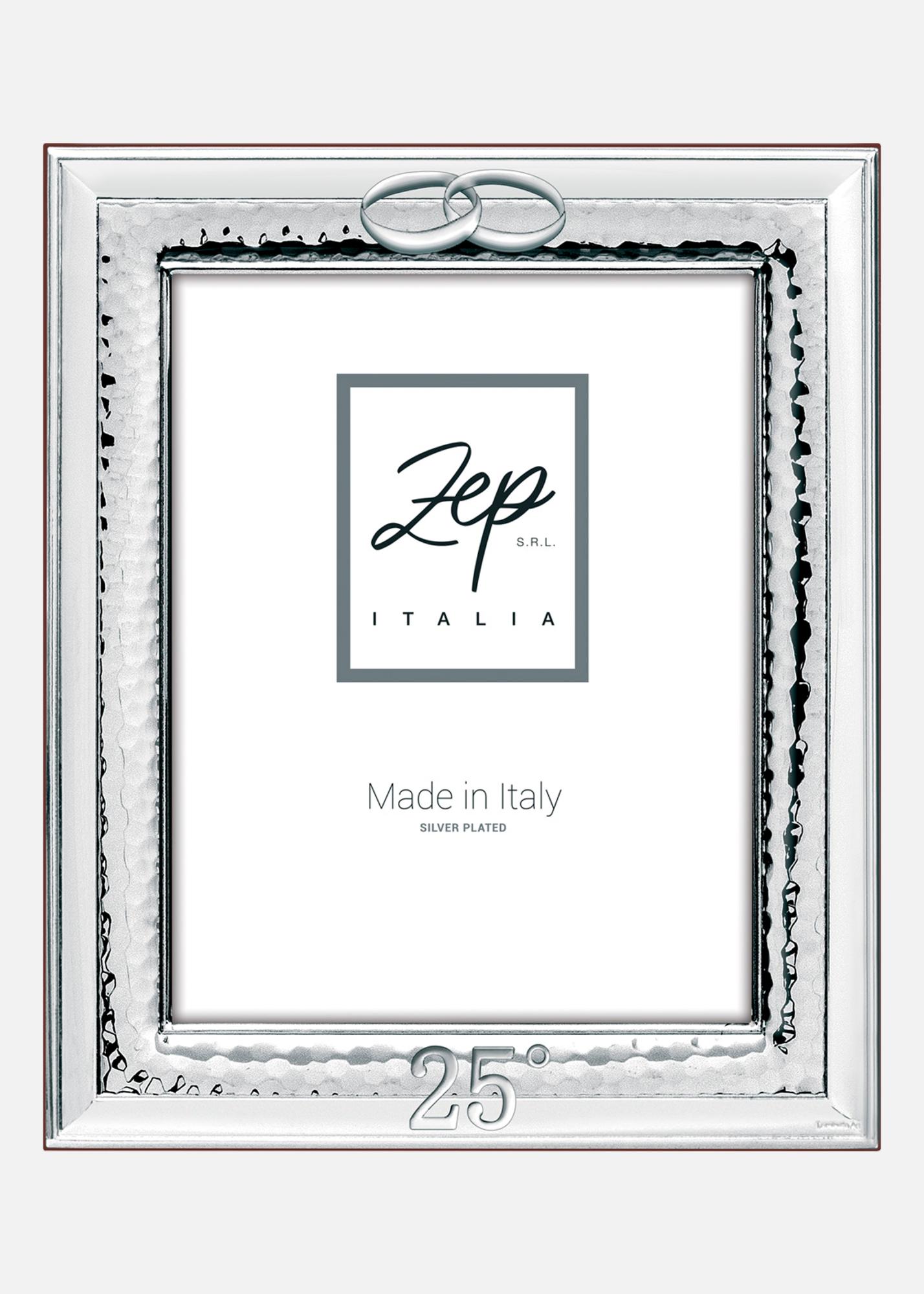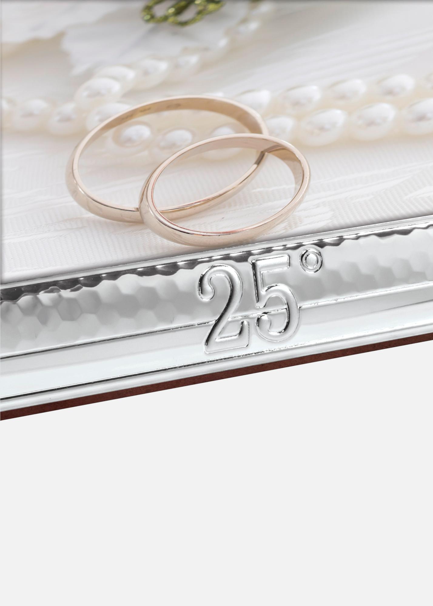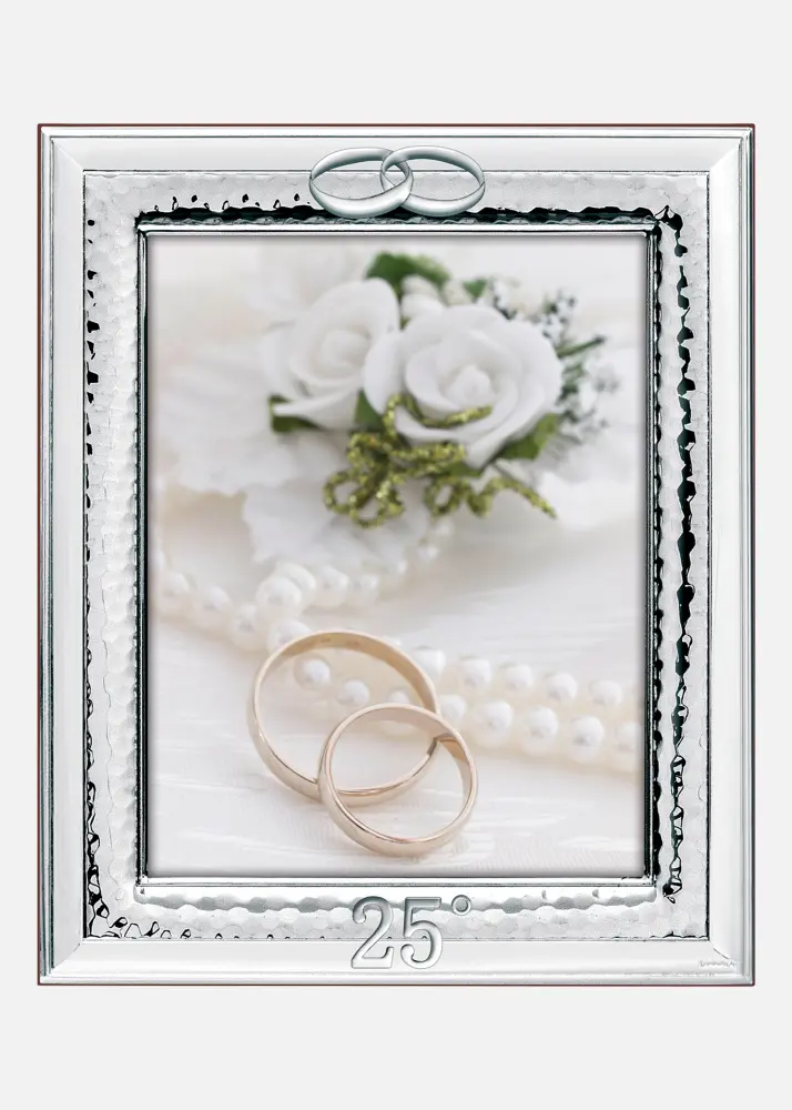 Eleganta sudraba pārklājuma foto rāmis ar kāzu tēmu. Savienotie gredzeni augšpusē un skaitlis "25°" apakšā padara to perfektu, lai svinētu 25 gadu jubileju, piemēram, sudraba kāzas.