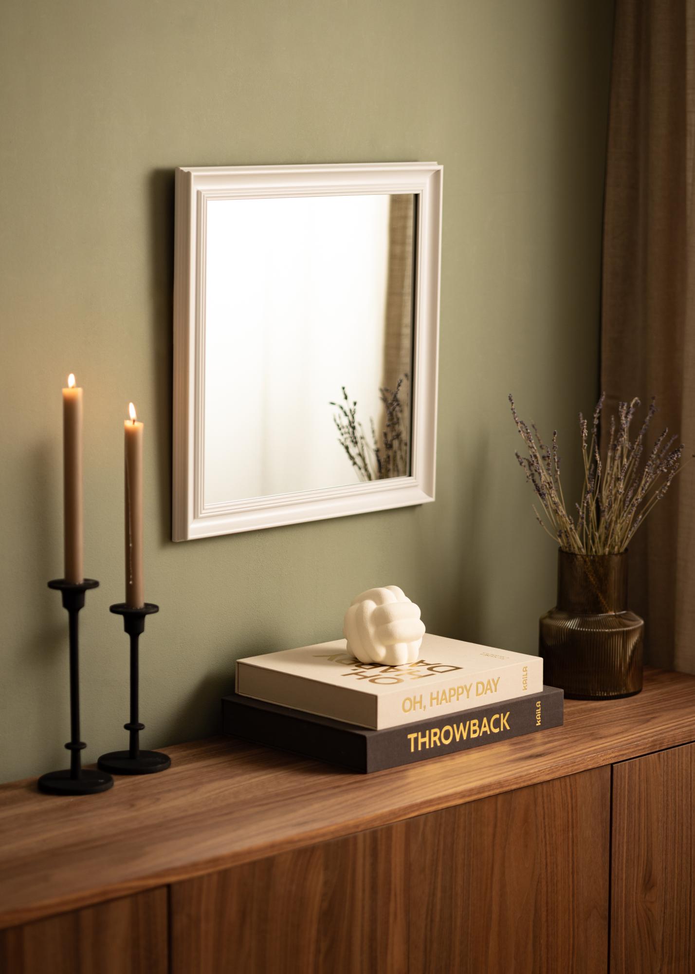 Alice Balta ir spogulis, kuras rāmis ir klasisks, stingrs dizains ar taisnām līnijām, kas izveidots, lai uzsvērtu motīvu.