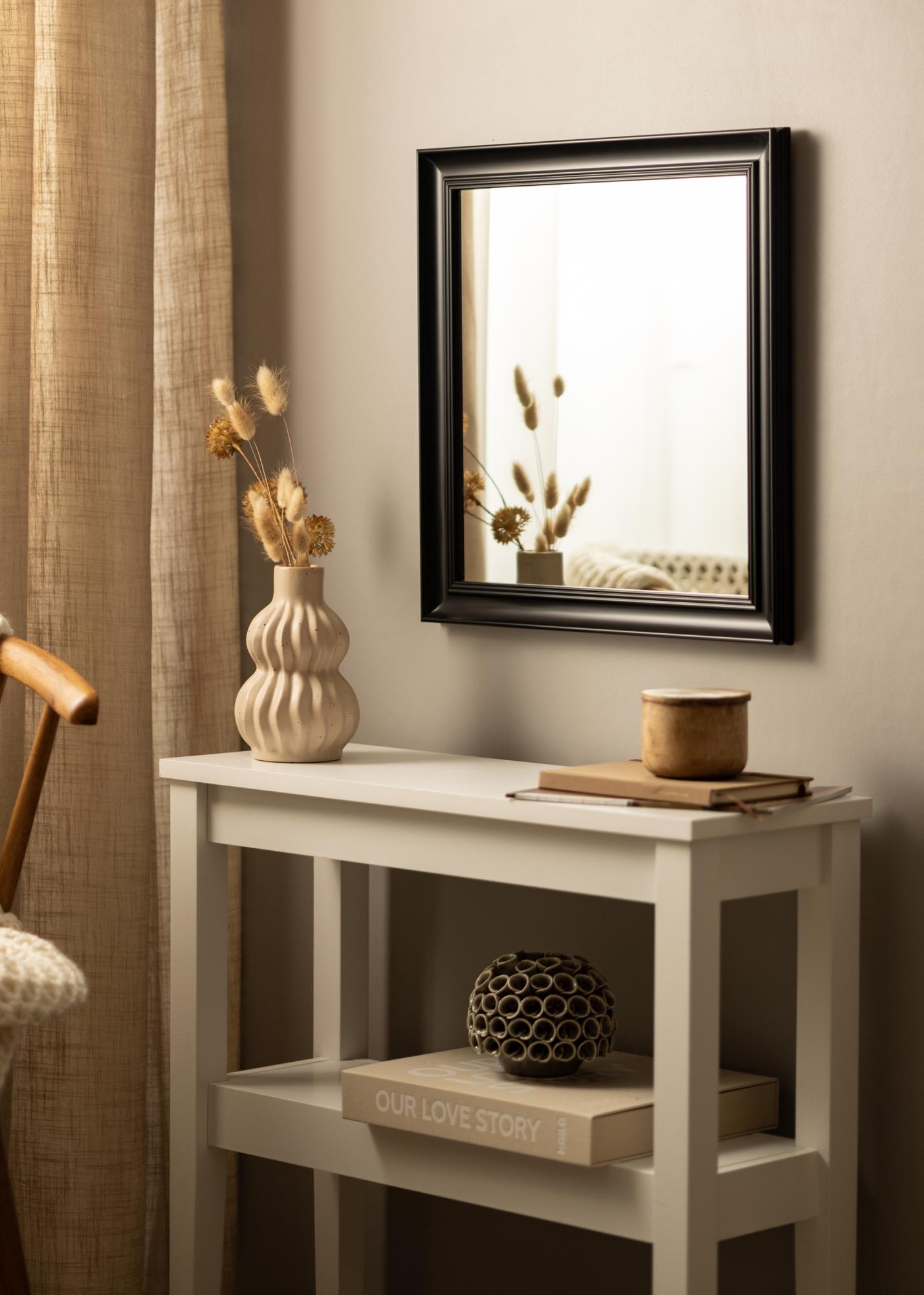 Alice Melna ir spogulis, kura rāmis ir veidots ar klasisku stingru dizainu ar taisnām līnijām, lai pievērstu uzmanību motīvam.