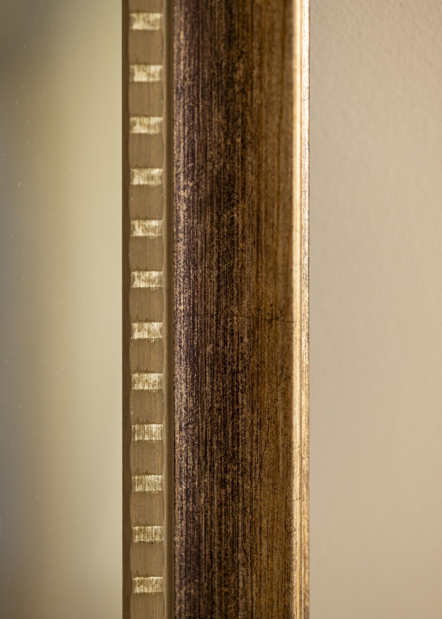 Dekoratīvā iekšējā mala ir rotāta ar maziem, regulāriem zelta krāsas elementiem. Tie rada elegantu kontrastu ar tumšāka koka toni un piešķir papildu sofistikācijas dimensiju. Ārējai malai ir mīksts slīpums ar smalku zelta apdari, kas piešķir rāmim greznu un mūžīgu sajūtu, kas nekad neiziet no modes.
