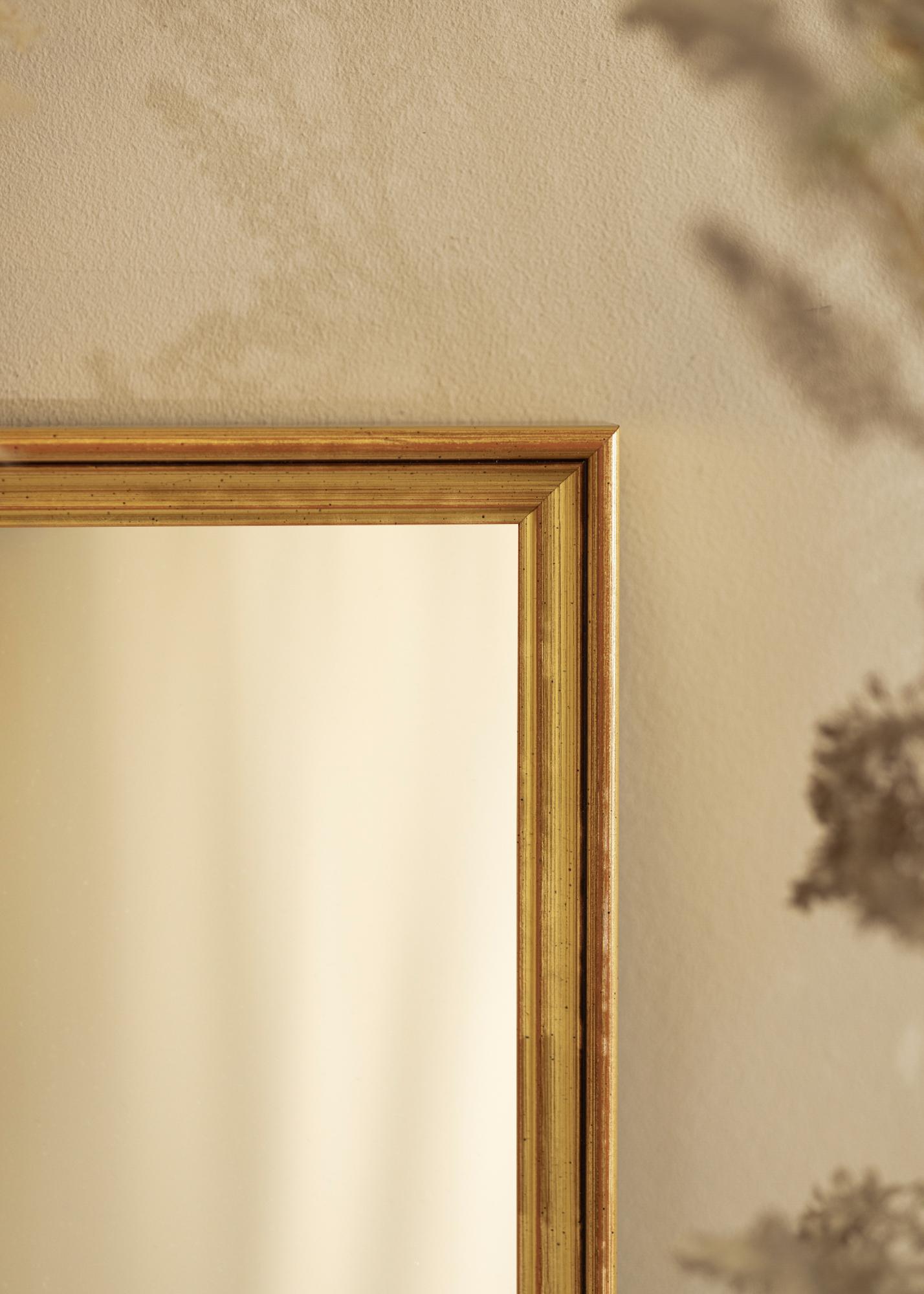 Šim spogulim ir 39 mm dziļums, kas nodrošina tā robusto sajūtu, nebūdams ne pārāk smags, ne pārāk dominējošs. Izgatavots no priedes, tas apvieno izturību un vieglumu, padarot to viegli montējamu uz sienas. Zelta virsmai ir viegla antīka apdare ar mazām tumšām detaļām, kas rada laikmetīgu raksturu, kas piemērots gan moderniem, gan klasiskajiem interjera stiliem.