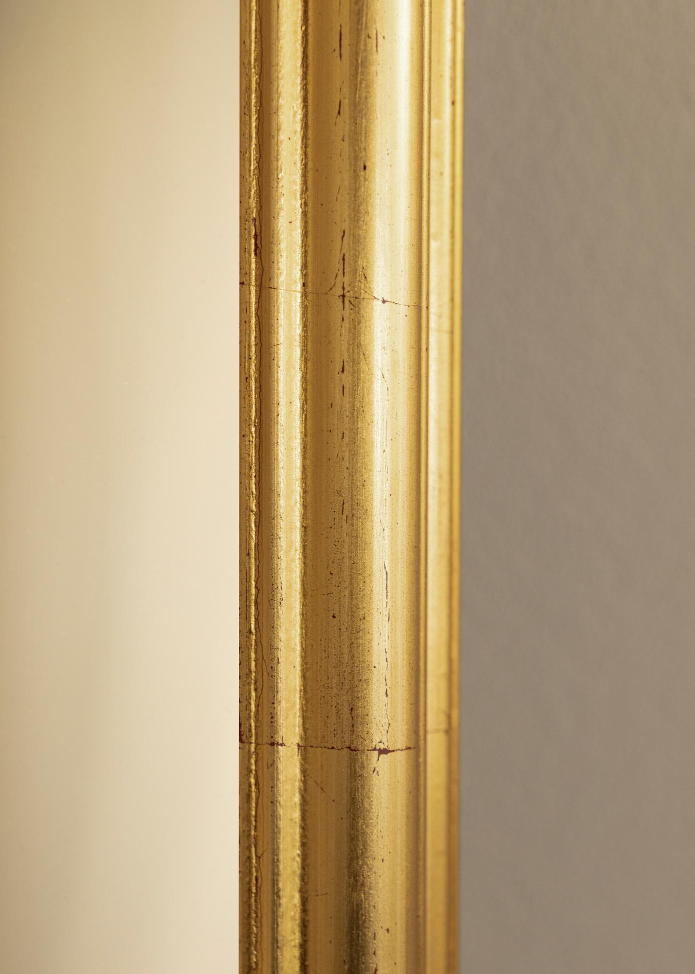 Rāmis ir izgatavots no ajosa koka un tam ir maigi izliekts profils, kas veicina spoguļa izsmalcināto izskatu. Virsma ir antīka ar smalkām krākelējumiem un mazām tumšām detaļām, kas piešķir spogulim autentisku vintage sajūtu. Zeltainais apdares tonis rada siltu un klasisku atmosfēru, kas ideāli piemērota, lai piešķirtu jūsu mājām laika gaitā neizplūstošu eleganci.