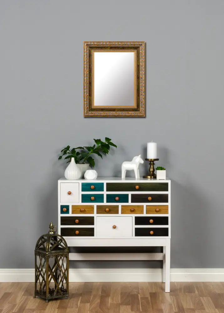 Ar pareizā spoguļa palīdzību jūs varat pacelt visu sienu! Šis greznais zelta spogulis ir ar aizraujošu dizainu, kas pievērš uzmanību. Priekšplānā koka rāmis ir gan ar lielu, gan mazāku joslu ar vijumu rakstu, kas tiek pārtraukts ar nobružātu daļu. Virsma ir apstrādāta, lai izskatītos raksturīgi novecojusi. Tā kā tas tiek ražots pēc jūsu izmēru norādēm, jūs varat būt pārliecināts, ka tas precīzi derēs tur, kur vēlaties!