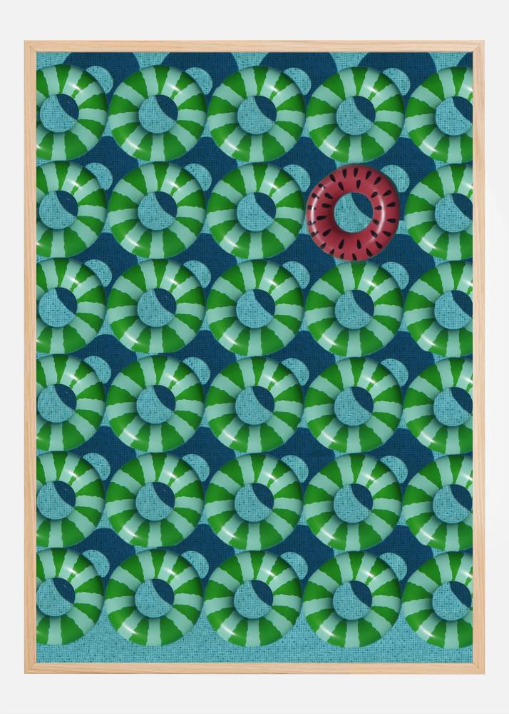Šis rotaļīgais un krāsainais plakāts ir veltījums individualitātei un oriģinalitātei. Vienveidīgu zaļo un balto peldriņķu jūrā viena vienīgā arbūza peldriņķis piesaista uzmanību un sniedz tūlītēju prieka un jautrības sajūtu. Šī izdruka ir ideāls vasaras pavadonis, kas izceļ unikālo iezīmi, kas izceļas no pūļa.
