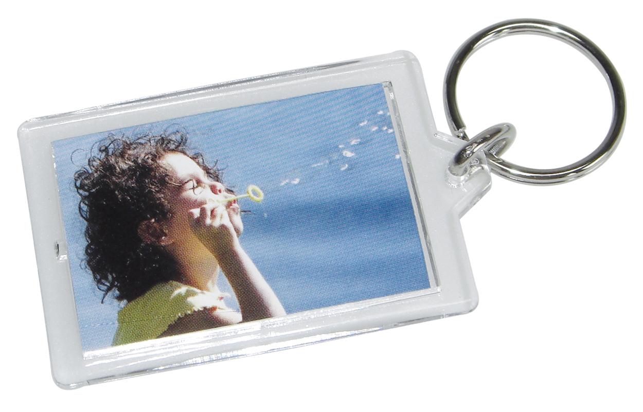 Nēsājiet līdzi savus mīļākos attēlus visur! Glīta atslēgu piekariņš no akrila plastmasas ar vietu 2 attēliem (priekšpusē un aizmugurē) izmērā 3,5x4,5 cm.