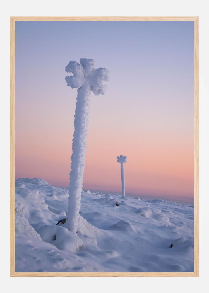 Šis plakāts attēlo sapņainu ziemas ainavu, kur sniegoti veidojumi paceļas no maiga, viļņaina sniega lauka. Motīvu raksturo miers un minimālisms, ar sarmotiem stabiem, kas gandrīz atgādina dabas skulptūras. Debesis rotā skaista krāsu pāreja, kas piešķir attēlam mierīgu un poētisku noskaņu – ideāli piemērots kā printēts attēls vai afiša, ja vēlies radīt harmonisku un modernu sajūtu mājās.